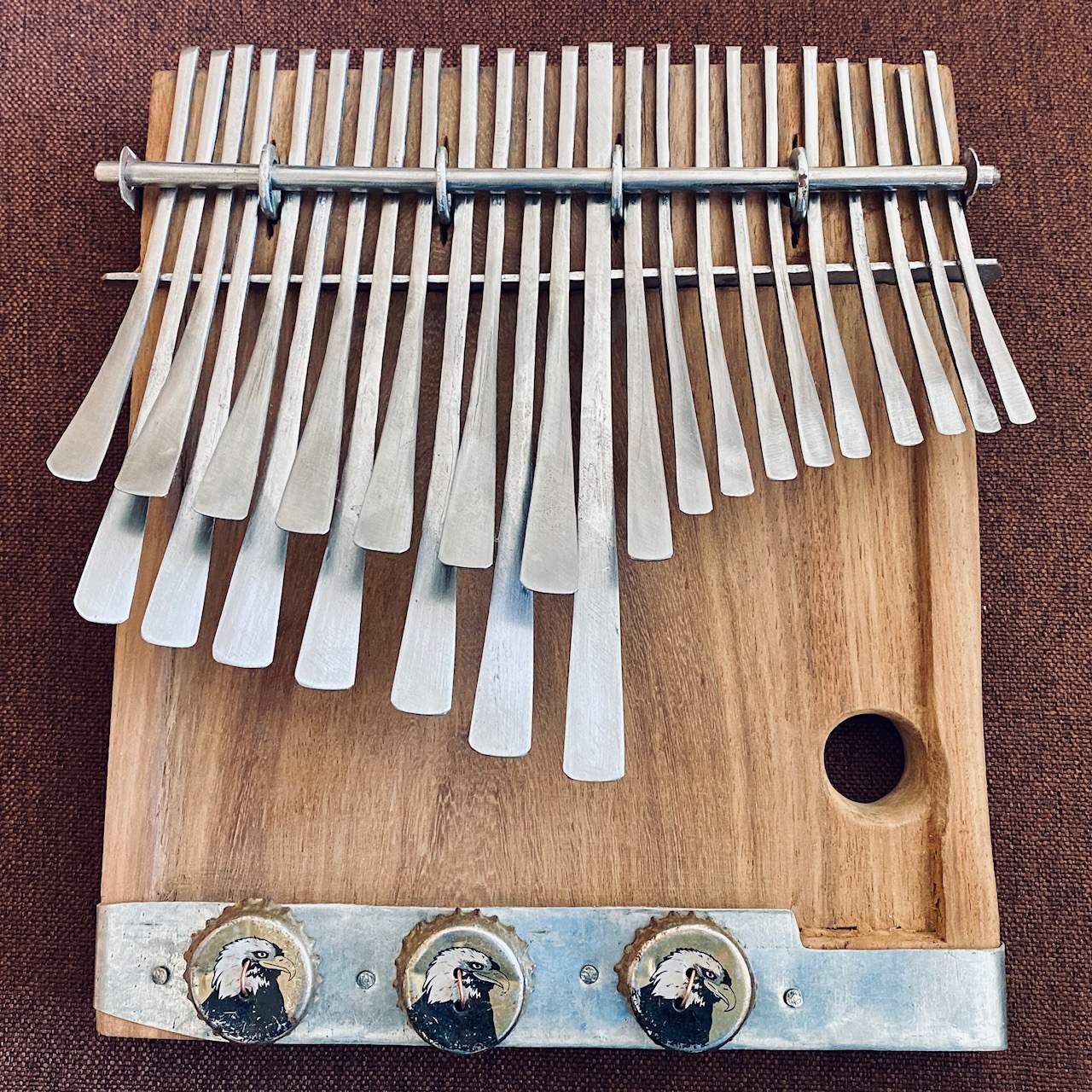 7 1/2″ (19 cm) wide board, 8″ (20 cm)key spread, 24-key mbira with eagle bottle top buzzers and bolted construction. The tuning is “MBIRA workshop pitch” (lowest note around B) nyamaropa tuning. Note: Photo is typical of this maker and tuning, however each mbira is individually handmade and may look slightly different.